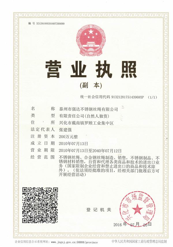 泰州市強達不銹鋼絲繩有限公司位于江蘇興化市戴南經(jīng)濟開發(fā)區(qū),公司致力于不銹鋼絲繩產(chǎn)品生產(chǎn),立志成為“國內(nèi)技術(shù)標(biāo)桿型吊索具生產(chǎn)企業(yè)”。以此戰(zhàn)略思想指導(dǎo),公司堅決貫徹“質(zhì)量贏市場,管理增效益,誠信贏天下”的質(zhì)量方針。以完善的服務(wù)在國內(nèi)不銹鋼絲繩市場樹立良好的品牌形象。公司榮獲“江蘇省質(zhì)量信得過企業(yè)。 靈活的管理機制,經(jīng)驗豐富的